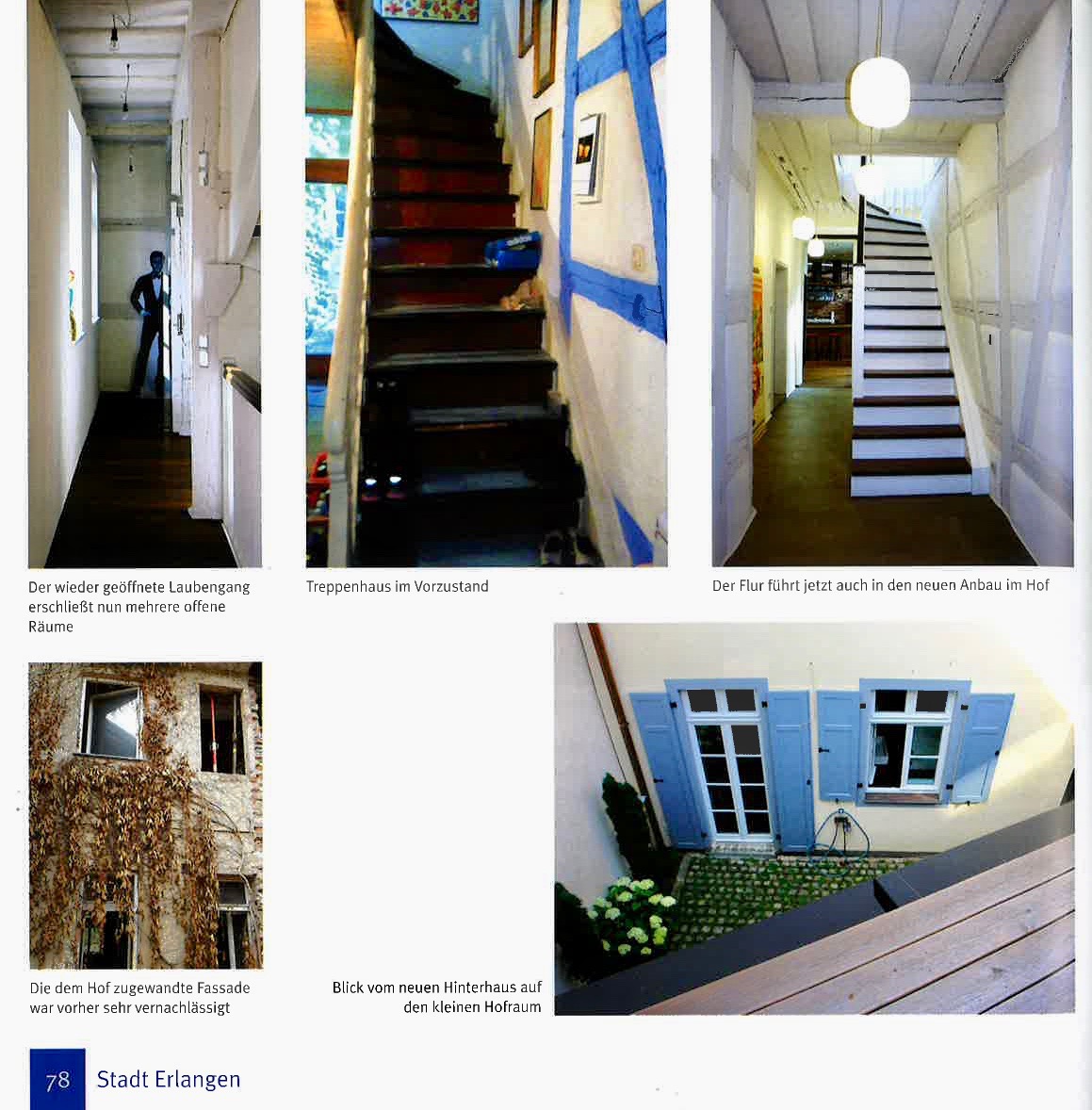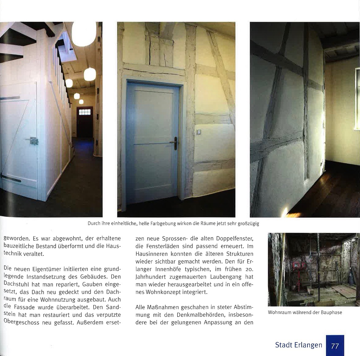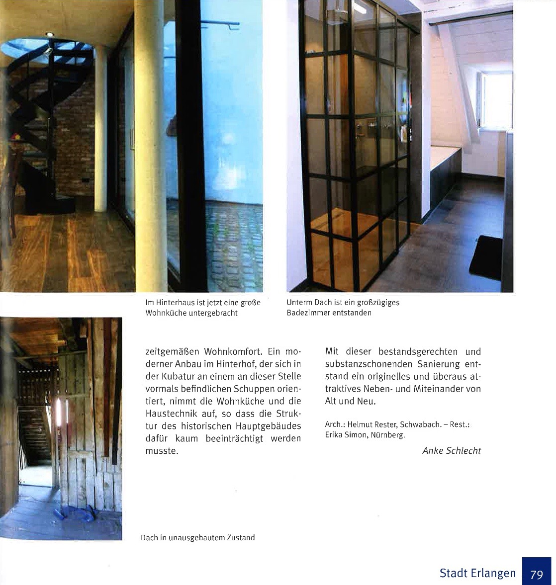 Zitat : "Alle Maßnahmen geschahen in steter Abstimmung mit den Denkmalbehörden, insbesondere bei der gelungenen Anpassung an den zeitgemäßen Wohnkomfort. Ein moderner Anbau im Hinterhof, der sich in der Kubatur an einem an dieser Stelle vormals befindlichen Schuppen orientiert, nimmt die Wohnküche und die Haustechnik auf, so dass die Struktur des historischen Hauptgebäudes dafür kaum beeinträchtigt werden musste. Mit dieser bestandsgerechten und substanzschonenden Sanierung entstand ein originelles und überaus attraktives Neben- und Miteinander von Alt und Neu." (A. Schlecht,Denkmalpflege in Mittelfranken 2019, 77-79 (Bad Windsheim 2020))