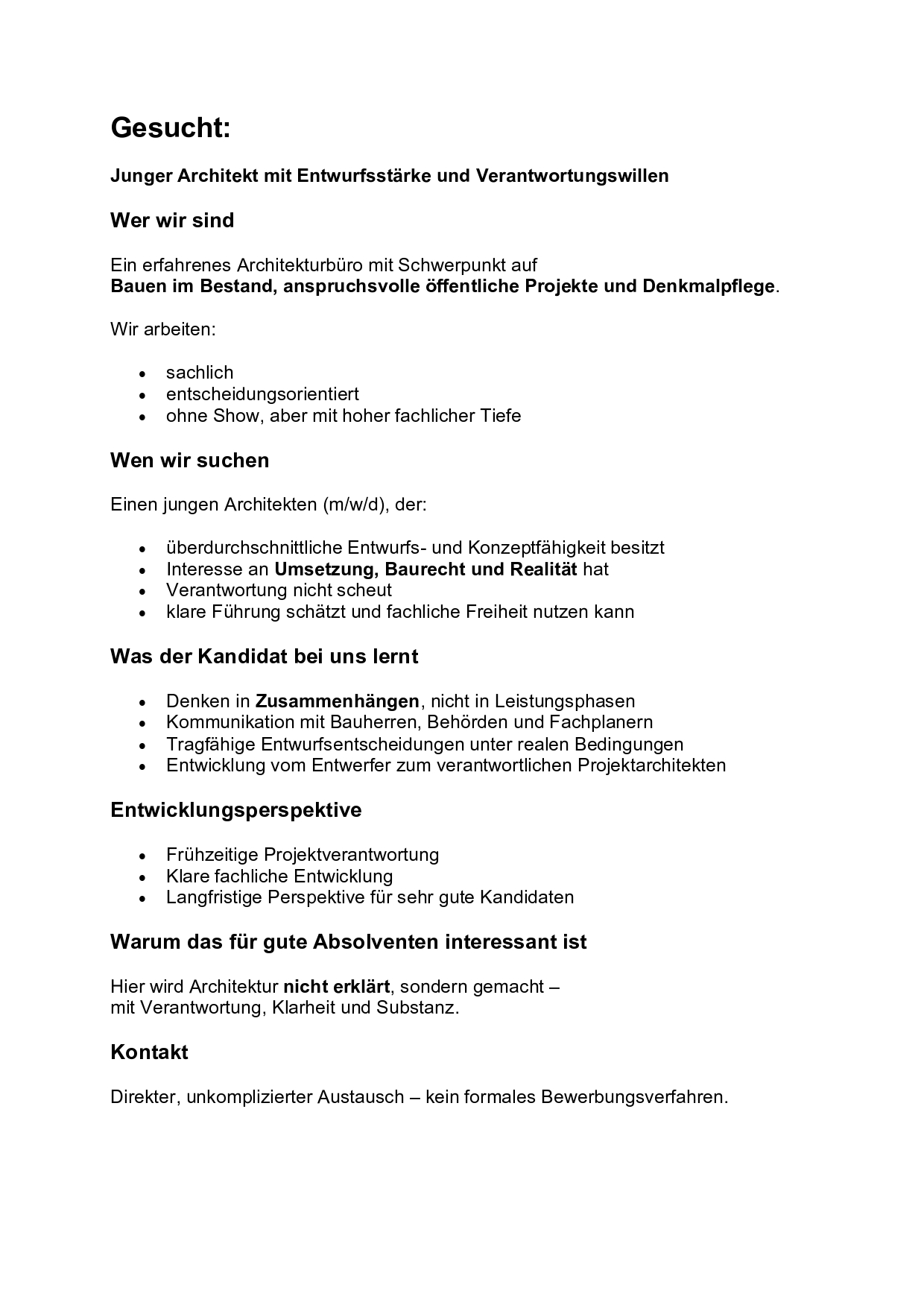 Wir suchen einen jungen Architekten (m/w/d), der kreative Entwurfsstärke, Interesse an Umsetzung und Baurecht sowie Verantwortungsbewusstsein mitbringt. Wer klare Führung schätzt und fachliche Freiheit nutzen will, ist bei uns richtig.