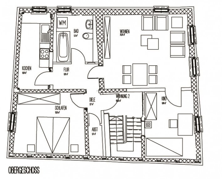 Die Dachschräge ist mit einer Zellulosedämmung in der Stärke von 20 cm gedämmt. Auf die Außenwand wurde ein Wärmedämmverbundsystem in der Stärke von 12 cm aus Steinwolllamellen aufgebracht. Unterhalb der Bodenplatte liegt eine Dämmung in der Stärke von 10 cm.
