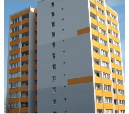Ausgangssituation Das Hochhaus wies vor seiner Modernisierung 2010 die typischen Mängel vieler Häuser aus den 50er Jahren auf: schlechter Wärmeschutz, ein hoher Energiebedarf und ein enormer CO2-Ausstoß. Der Primärenergiebedarf lag 164% über den Anforderungswerten der Energieeinsparverordnung für einen Neubau. Die CO2 Emission lag bei etwa 82 Tonnen im Jahr. Senkung der Energiekosten um 78% Der hohe Wärmeverlust durch die Außenwände wurde als erstes angegangen. Alle Außenwände und das Dach wurden gedämmt, neue Fenster wurden eingebaut. Die energetischen Werte verbesserten sich dadurch erheblich. Durch die Installation von Heizungs- und Trinkwasser- unterstützenden Solarkollektoren und eine dezentrale Lüftungsanlage mit Wärmerückgewinnung wurden die Energiekosten um 78 % gesenkt. Das Haus liegt jetzt mit seinem Primärenergiebedarf um 48% unter dem durch die Energieeinsparverordnung geforderten Wert und erreicht damit die Vorgaben für ein Passivhaus. Mehr Wohnkomfort Weitere Verbesserungen zur Erhöhung des Wohnkomforts sind ansprechend geflieste Böden im Treppenhaus, ein frischer Gebäudeanstrich innen wie außen, neue Briefkästen, ein Fahrradraum, einbruchsichere Wohnungstüren, Waschmaschinenräume und ein barrierefreier Zugang. Die Balkone wurden vergrößert oder umgebaut in ganzjährig nutzbare Wintergärten.