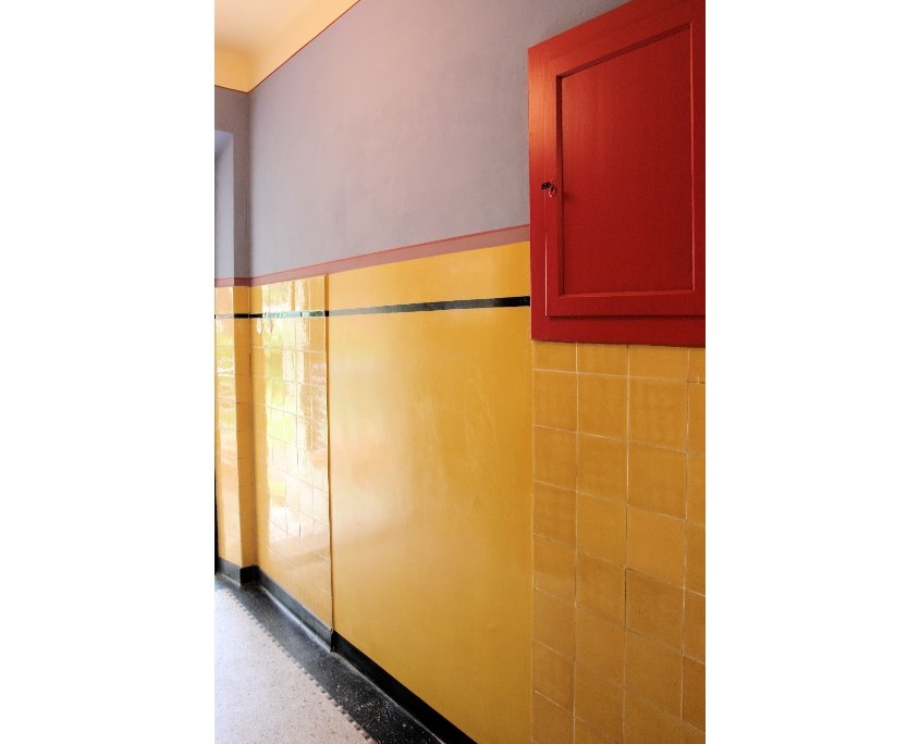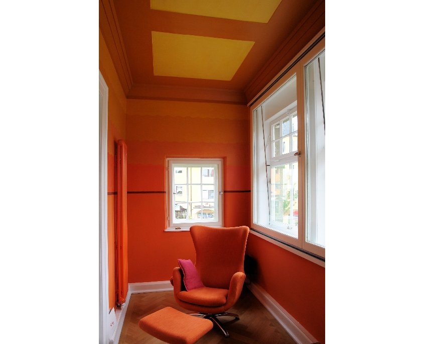 Im Eingangsbereich und im Wintergarten wurden die expressionistischen Wandfarben, die dem Stil von Bruno Taut folgen, restauriert. Bauzeitliche Möbeleinbauten hat man aufgearbeitet und die originalen Stuckelemente der Decken überholt. Im Ergebnis ergänzen sich die vielen Einzelmaßnahmen zu einer vorbildlichen Gesamtsanierung, die ein ungewöhnliches Denkmal in Schwabach dauerhaft erhält.