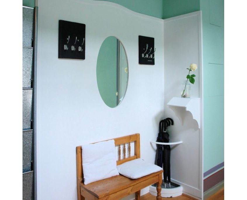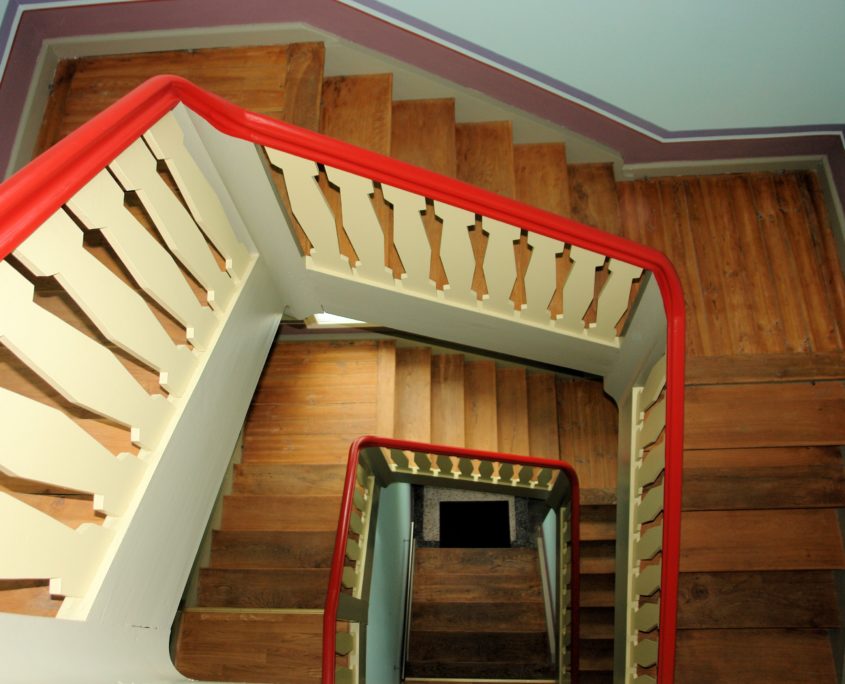 Das Dachgeschoss sollte über zwei Ebenen ausgebaut werden. Auf Zwischenwände war möglichst zu verzichten, um die Raumhaltigkeit des Dachstuhls zu erhalten. In die ehemaligen Arzträume im Erdgeschoss war in die bestehende Raumstruktur eine Wohnung unterzubringen. Die ursprünglichen Wandoberflächen mit ihrer Farbigkeit waren freizulegen und zu restaurieren.