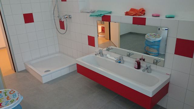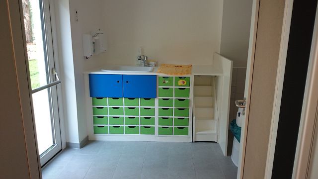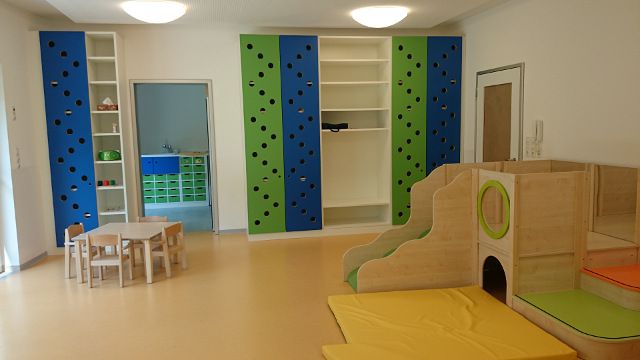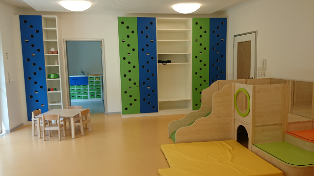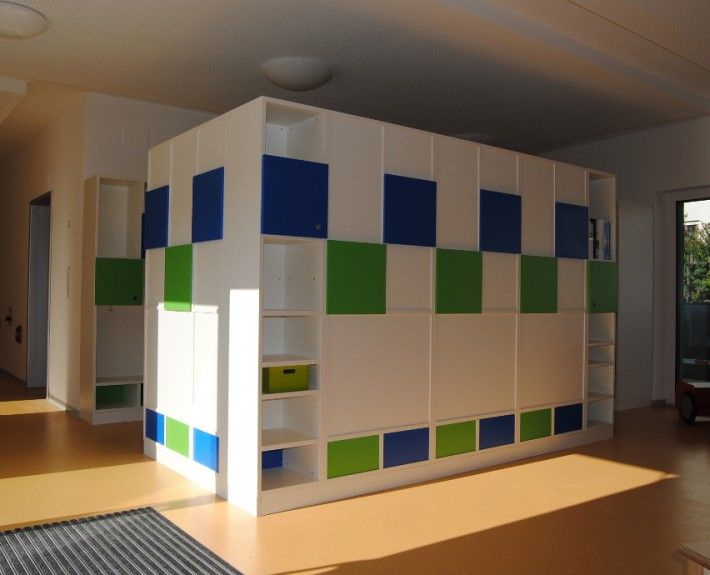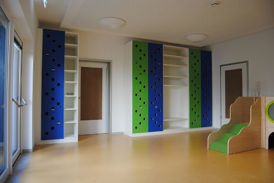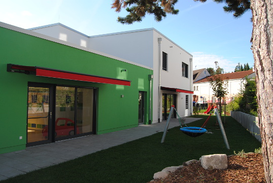 Trotz nicht idealer Lage wurde auf einem in der Fläche sehr begrenztem Grundstück, dennoch ein sehr ansprechender und sicherer Betreuungsort für 26 Kinder geschaffen. Besonders hervorzuheben ist das Zusammenspiel von Einrichtung und Fassadengestaltung. Der Kreis als bestimmendes Element sowie die Farben grün und blau für die Kindergruppen „Frösche und Fische“ ergeben ein stimmiges Gesamtkonzept. Übersicht der Referenzen >