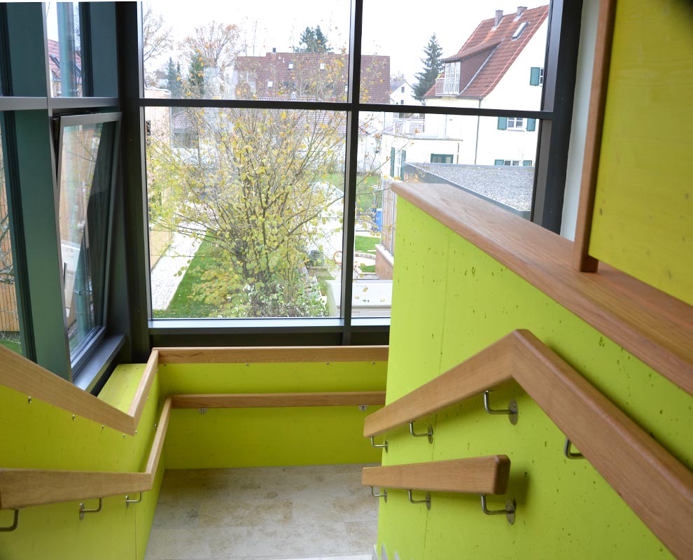 Bei der Errichtung der KITA wurde besonderes Augenmerk auf eine ökologische Bauweise gelegt. Es wurden überwiegend nachwachsende Rohstoffe verwendet. Das Gebäude wurde in Holzrahmenbauweise konstruiert und weist eine ISO-Flock-Dämmung aus Recyclingmaterial auf. Auch im Innenraum dominieren natürliche Materialien wie Holz, Naturstein und Beton mit farbigen Akzenten.