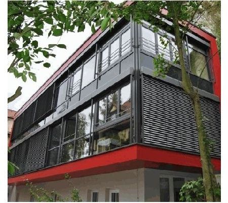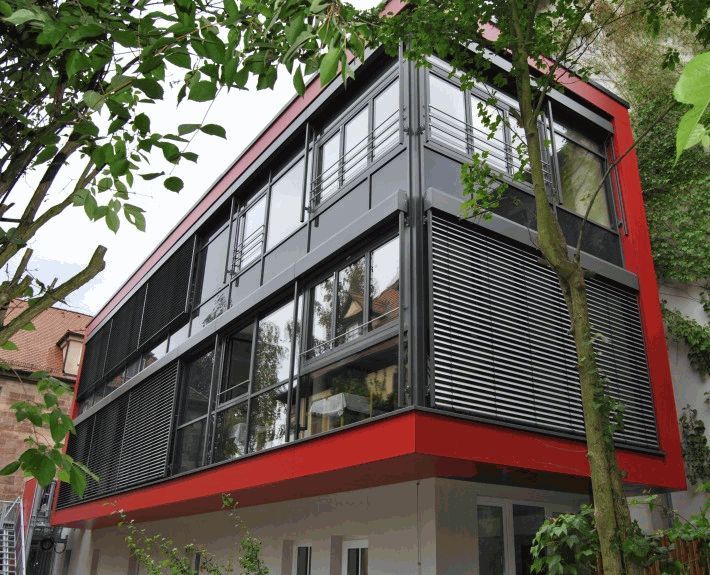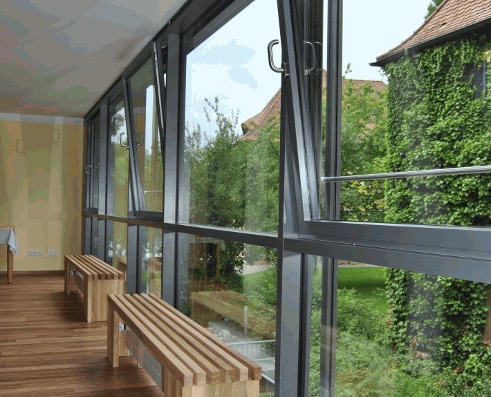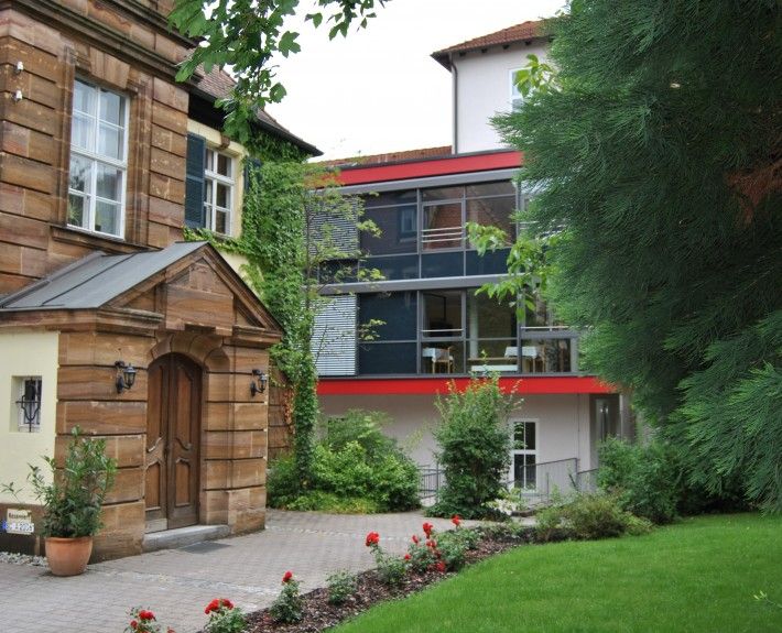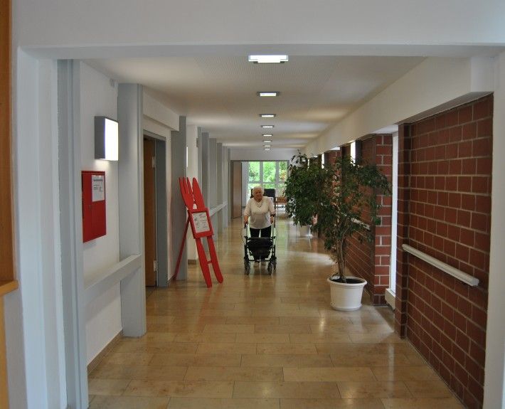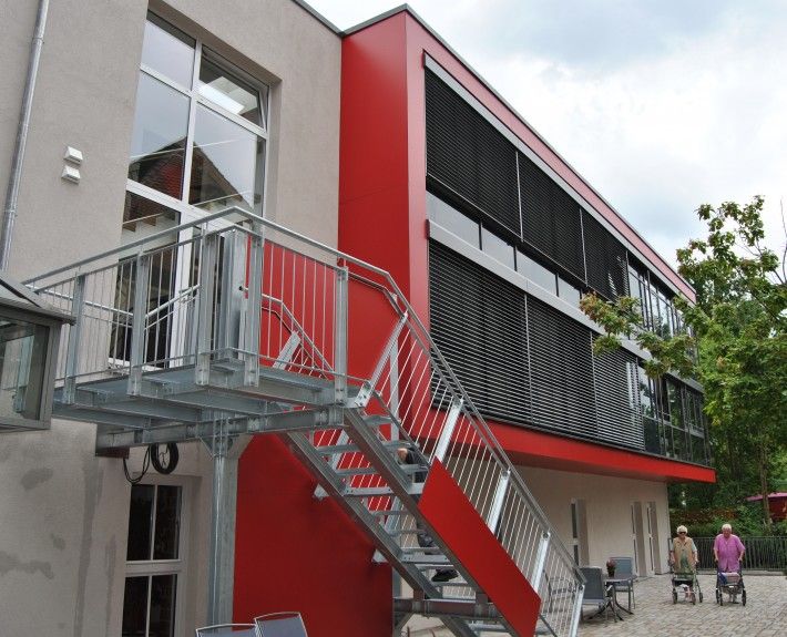 Kleine Ursache, große Wirkung. Zur Erweiterung des Pflegeheimes wurde über den bestehenden erdgeschossigen Baukörper ein zweigeschossiger, klar ablesbarer, neuer Baukörper gesetzt. In den dort geschaffenen Flächen sind Gemeinschafträume mit einer Gemeinschaftsküche untergebracht. Durch die großen Glasflächen in der Riegel-Pfostenfassade und die Orientierung zu den Grünflächen wird für die älteren Menschen die Lebensqualität wesentlich erhöht. Zusammen mit der Modernisierung der Fassade des historischen Sandsteingebäudes wird die auch für ein Pflegeheim wichtige Attraktivität der Außenwirkung entscheidend gesteigert.