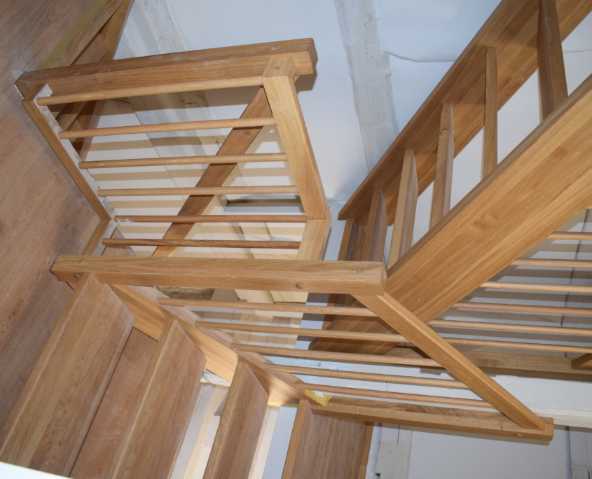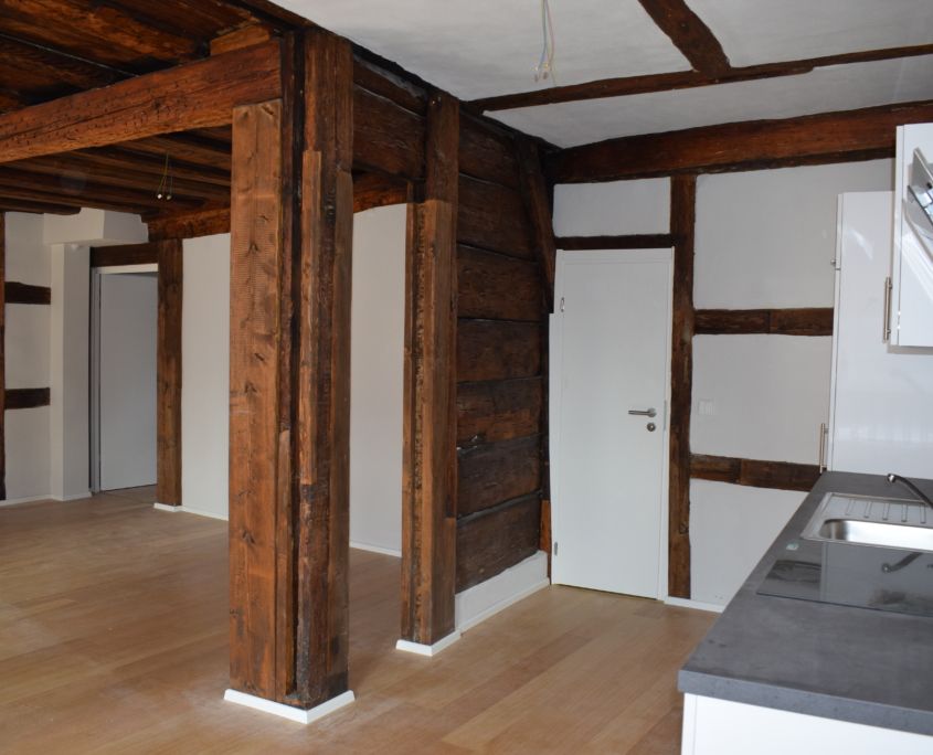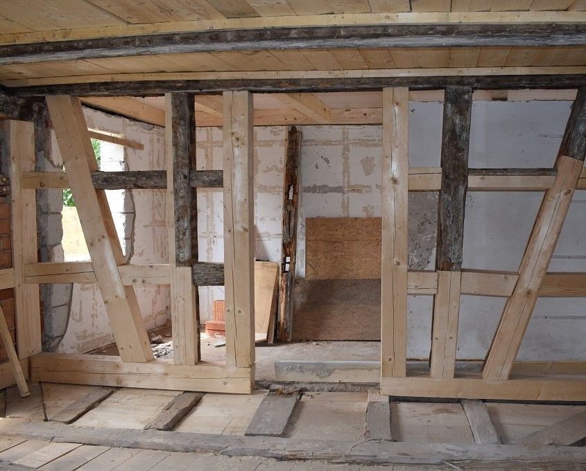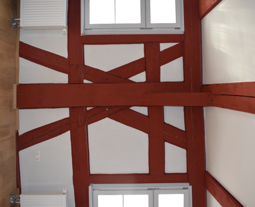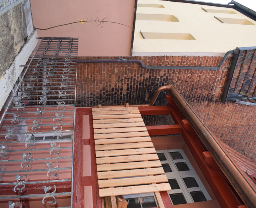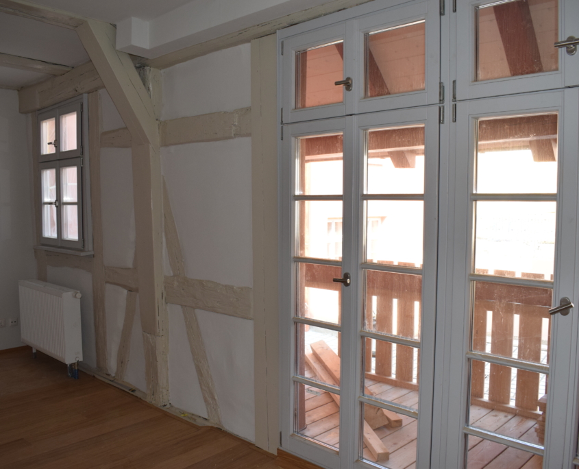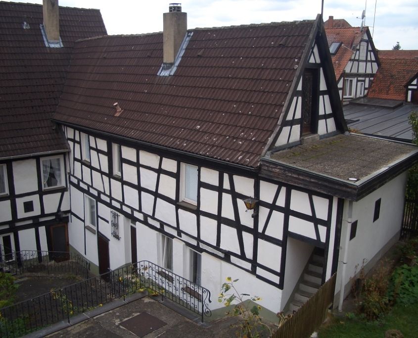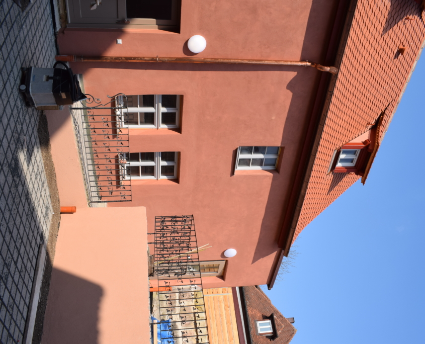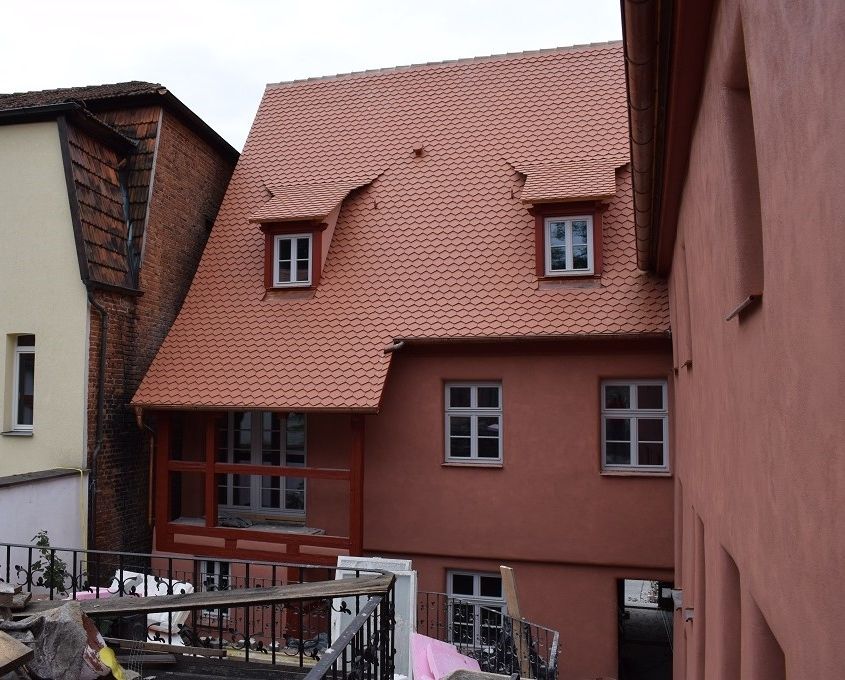 Eigentlich war das zweigeschossige Bürgerhaus mit traufständigen Sandsteinquaderbau auf Anfang des 18. Jhd. datiert. Die von Herrn Schatz durchgeführte Befunduntersuchung mit Auswertung der dendrochronologischen Bohrkerne ergab ein Gebäude im Kern aus den Jahren um 1510. Besonders sind dabei die Bohlenbalkendecken, Bohlenwände und der liegende Dachstuhl aus dem Entstehungsjahr des Gebäudes zu erwähnen. Zusammen mit dem Flügelanbau werden in dem Gebäude fünf Wohnungen von 30 bis 100 m2 untergebracht. Bei der Gestaltung der Grundrisse wurde auf das historisch entwickelte Raumgefüge Rücksicht genommen, aber gleichzeitig spannende zeitgemäße Grundrisse geschaffen.