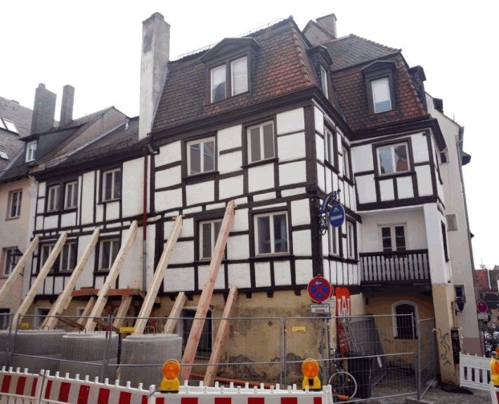 Im Juli 2010 musste das Gebäude von der Bauordnungsbehörde der Stadt Nürnberg wegen akuter Einsturzgefahr gesperrt werden. Im August 2010 wurde eine Strebkonstruktion errichtet, die das marode Gebäude vorläufig sicherte, leider aber auch einen Teil der Unteren Schmiedgasse für den Straßenverkehr unbefahrbar machte.