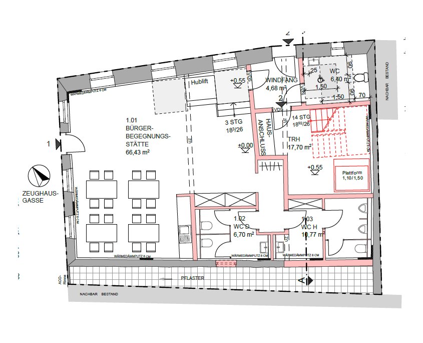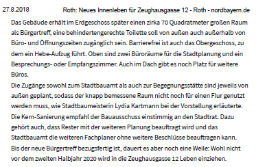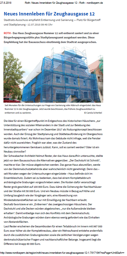 Durch eine komplette Sanierung erstrahlt das verfallene frühere Zeughaus Stüberl in der Zeughausgasse 12, Roth wieder in neuem Glanz. Die Bereiche Stadtplanung und Städtebauförderung der Bauverwaltung der Stadt Roth ist in das Ober- und das Dachgeschoss eingezogen, im Erdgeschoss wurde Platz für einen Bürgertreff geschaffen.